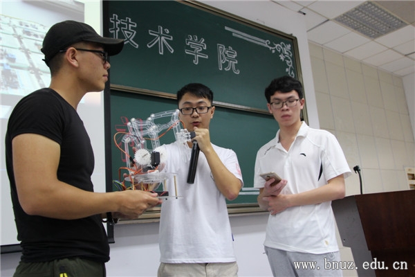 老生代表张润发同学分享了他在大学的学习和生活情况,并介绍和展示了他在学院电子与机器人实验室所参与的项目和设计制作的作品。