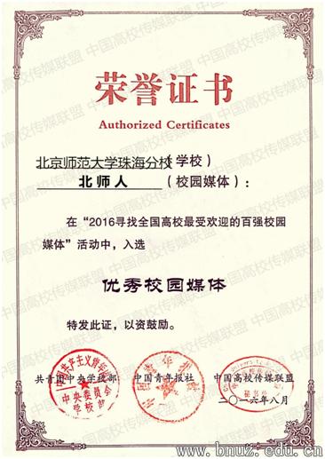 本网讯(通讯员 刘玮宁)我校国家级大学生创新创业项目北师人BNUZER荣获“2016寻找全国高校最受欢迎的百强校园媒体”优秀校园媒体奖。据悉,本次“2016寻找全国高校最受欢迎的百强校园媒体”由共青团中央学校部,中国青年报社、中国高校传媒联盟发起举办,全国有近千余家高校校园媒体参与,由受众投票和专家评选两部分组成,全国仅有 30家校园媒体获评“优秀校园媒体奖”。