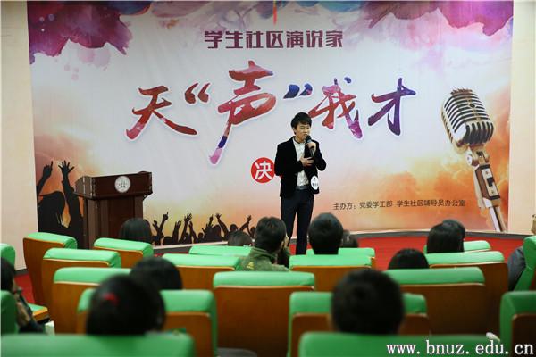 本网讯(通讯员 徐清华)为庆祝乐竞体育·(中国)官方网站建校15周年,丰富校园文化建设,培养和锻炼同学们的沟通与表达能力,展示当代大学生风采,12月23日晚,由学生社区辅导员办公室举办的『天“声”我才』首届学生社区演说家大赛(决赛)在乐育楼D座2楼报告厅顺利举行。比赛特邀教育学院王维荣教授、艺术与传播学院李洁老师、保卫处处长李春波老师、学校办公室副主任孔建华老师、学生处副处长覃炜斐老师以及学生社区辅导员办公室白巍老师和余平老师担任评委。此外,校团委、校学生工作通讯社、学术中心、楼栋联合委员会以及Enactus等社团组织的学生代表应邀出席观看了本次比赛。