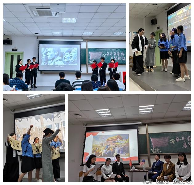 第一组以百年风华正茂为主题,采用PPT讲述和抒情朗诵等方式清晰地阐述了五四运动与中国共产党的关系,并从爱国、进步、民主等方面更加全面的为现场观众展现了五四运动的内涵,让观众更为深刻地感受到五四青年的活力与责任担当。第二组采取话剧的方式重演历史事件,展现了以“外争主权,内除国贼”为口号的五四青年的无畏与果敢,那份激荡的爱国赤诚唤起了同学们的共鸣。第三组以外交为切入点,采取模拟谈判的方式,还原了巴黎和谈的针锋相对。第五组表演了五四话剧《破晓》,再现了几位进步青年面对民族兴亡团结一致、共同抗日的英勇无畏,并对当代青年所承担的历史使命和社会责任做出了自己的回答。第六组则采用诗朗诵的方式,在中国共产党成立一百周年之际,用自己的方式表达对党的祝福。