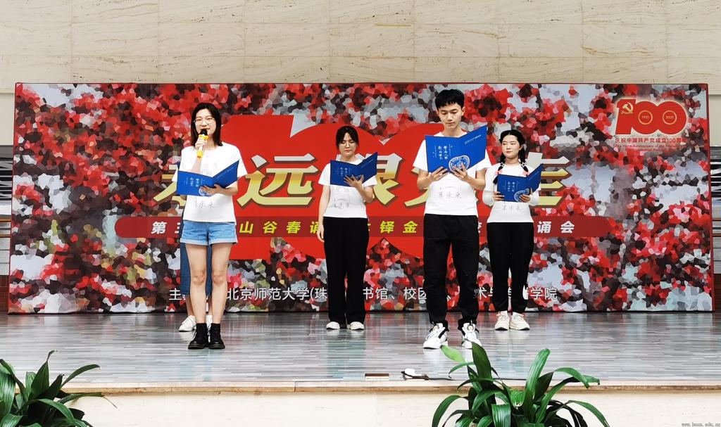本网讯(通讯员郑勇)4月23日,由图书馆、校团委和艺术与传播学院联合主办第三届“山谷春诵•木铎金声”校园朗诵会在图书馆二楼大厅举行。本次朗诵会主题为“永远跟党走”,来自园区不同学院的同学组成16支代表队登上舞台,讴歌中国共产党的丰功伟绩,颂扬优秀党员的先进事迹,表达牢记初心使命、奋发有为、永远跟党走的信念和决心。