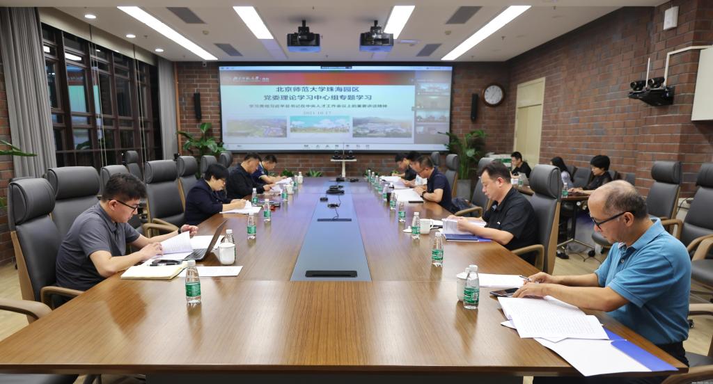 10月17日晚,珠海园区党委理论学习中心组召开会议,专题学习习近平总书记在中央人才工作会议上的重要讲话精神。学习采取视频连线形式,园区领导班子成员分别在珠海和北京参加学习。园区非党员领导班子成员、园区领导小组办公室有关同志、园区党委工作部门有关同志列席会议。专题学习会议由北京师范大学党委常委、副校长,珠海校区管委会主任,珠海分校校长王守军领学。