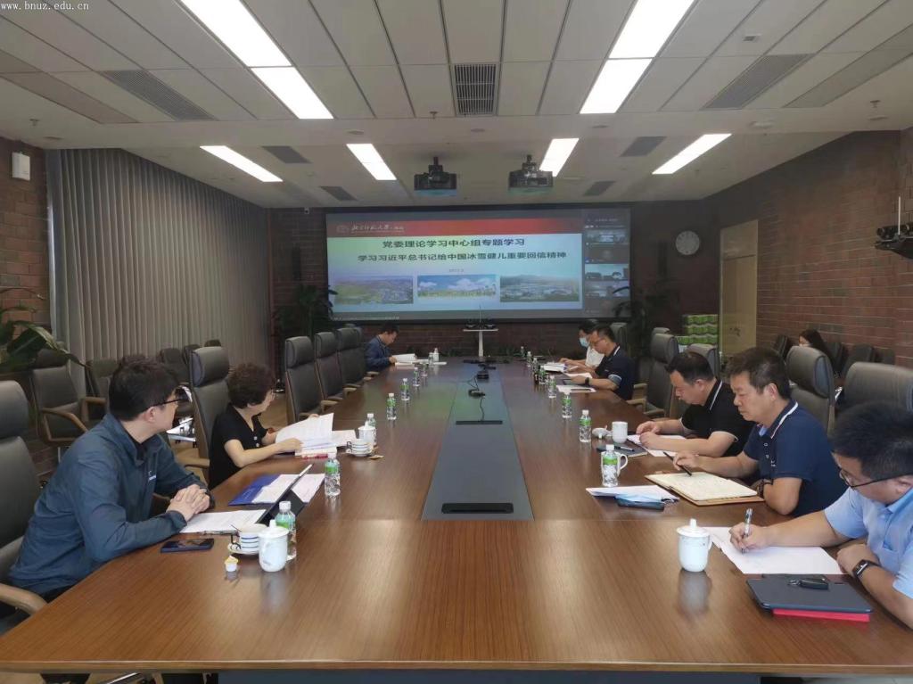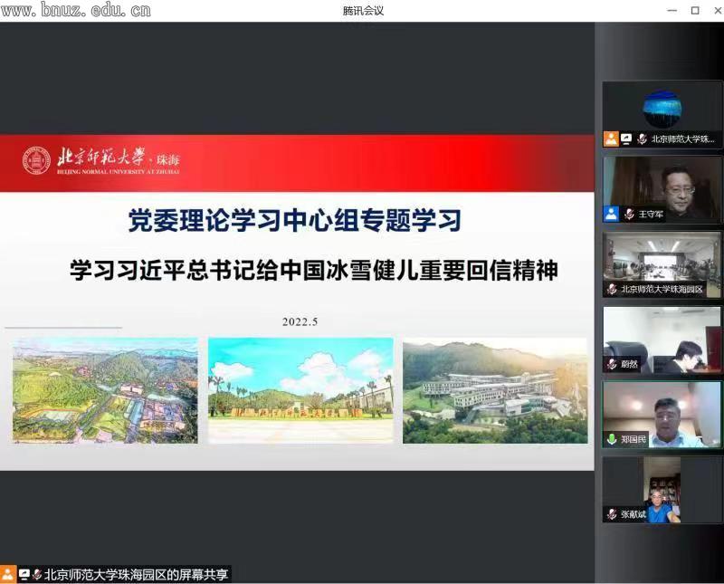 5月13日下午,北京师范大学珠海园区举行党委理论学习中心组专题学习会,专题学习习近平总书记给中国冰雪健儿重要回信精神。学习采取视频连线形式,园区领导班子成员分别在北京和珠海参加学习。园区非党员领导班子成员、珠海园区领导小组办公室有关同志、党委工作部门有关同志列席会议。专题学习由北京师范大学校长助理、珠海校区管委会副主任、珠海分校副校长郑国民领学。