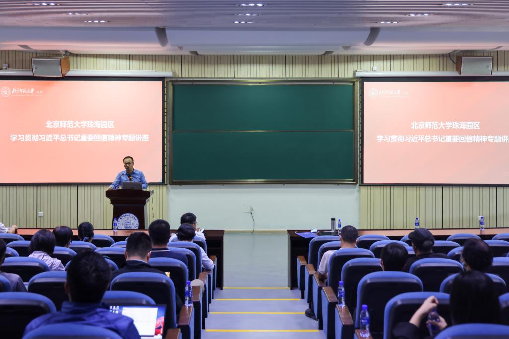 为深入学习贯彻习近平总书记给“优师计划”师范生重要回信精神, 10月19日,北京师范大学珠海园区邀请校长助理、珠海校区管委会副主任、珠海分校副校长郑国民作“深悟习近平总书记重要回信精神,展望新时代教师教育改革发展”专题讲座,园区全体中层干部、教工党支部书记等80余人参加了讲座。讲座由校区管委会副主任、秘书长、分校副校长戴伟主持。