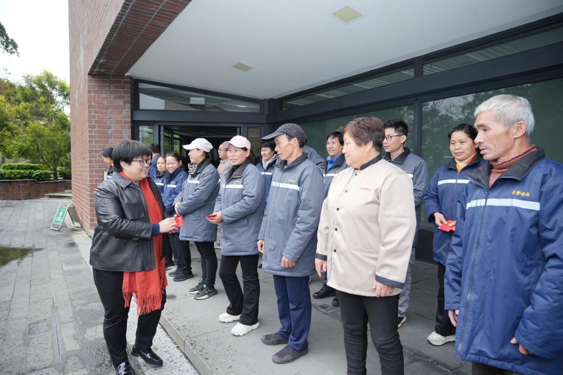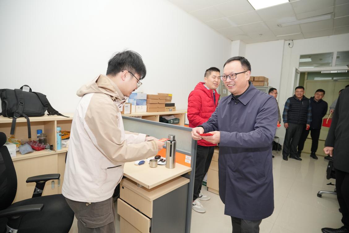 “感谢你们,辛苦了!祝大家新年快乐!”园区领导向每一位在假期依然奋战在一线的教职员工致以衷心的感谢和新春的问候,关切地询问大家近日工作和生活情况,详细了解假期校园安全稳定、后勤保障等工作安排,感谢大家这一年的辛勤奉献,并送上春节慰问品。