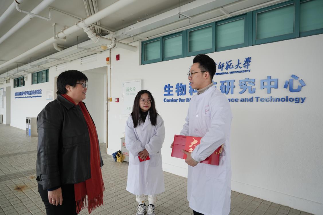 玉兔献瑞辞旧岁,金龙添福迎新春。2月9日上午,北师大党委副书记、珠海校区党委书记、珠海分校党委书记韦蔚带队先后走访教学科研实验室、教室管理中心、应急指挥中心、网络信息中心、后勤车队、绿化队、值班食堂、理工楼工地、卫生服务中心、保卫处、物业公司、学生住宿区、配电房、国际交流中心等,代表学校亲切慰问寒假春节期间坚守岗位的教职员工和留校学生,向大家送去节日的问候和新春的祝福。珠海校区管委会副主任、秘书长、珠海分校副校长戴伟,珠海校区党委副书记、珠海分校党委副书记韩舰参加慰问。