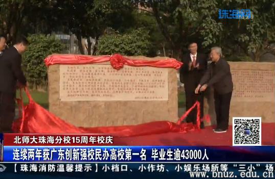 昨天还举行了校史铭碑揭幕仪式、庆祝酒会、认养认捐校园景观树木等系列活动。省人大常委会副主任刘悦伦为北师大珠海分校第三座碑石揭幕。建校之初,珠海分校便在百年纪念广场矗立了20座纪念碑石,每5年篆刻1座,记录学校大事记和铭文。十五年来,该校在教学模式、管理方式等方面积极改革尝试,努力打造教育与科技产业复合发展、特色鲜明的综合性改革实验区。2015和2016连续两年在广东省创新强校考核中位列一般本科高校(民办类)第一名。目前设有15个学院(部)、61个本科专业,全日制在校生近23000人,累计毕业43000多人,其中近3200名学生出境深造,近两年比例超过10%。