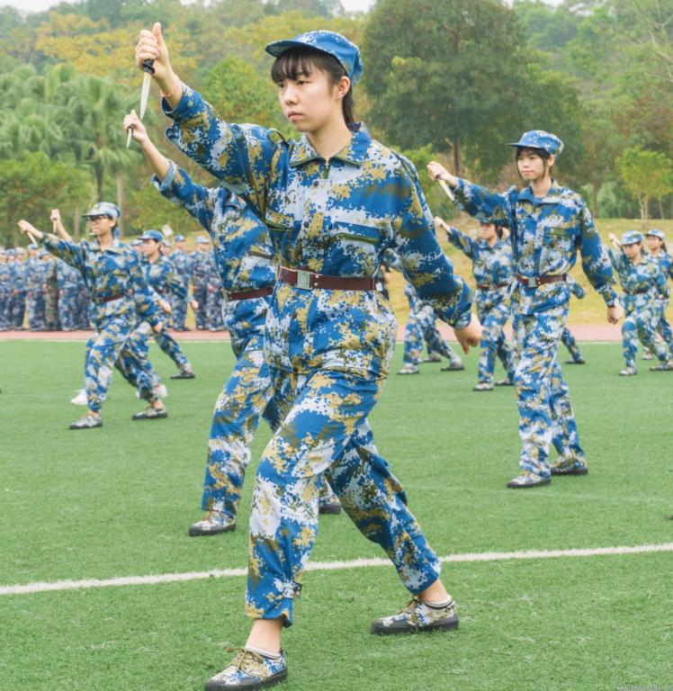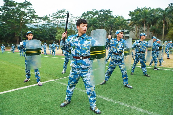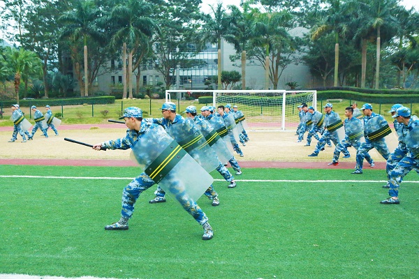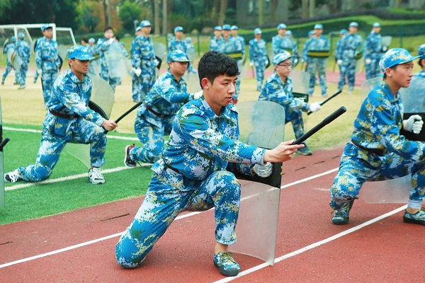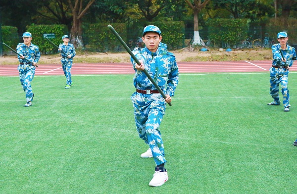 现场,由7个学生特色方阵“单个军人队列动作”、“警棍盾牌操”、“匕首操”、“刺杀操”、“应急棍术”、“擒敌组合”、“特种战术基本动作”,进行训练成果展示。