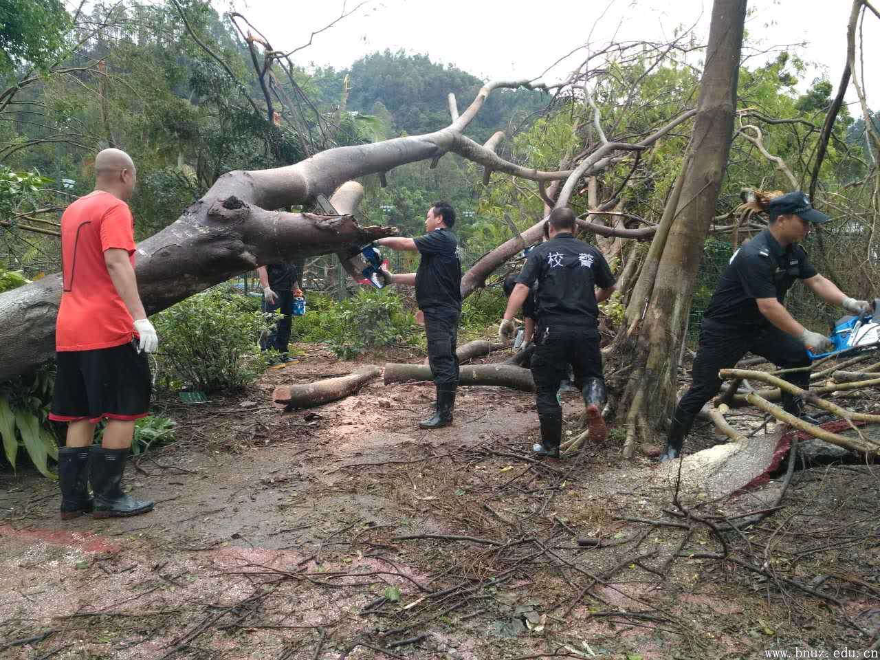 在台风过后,因校内出现多处树木倒伏且数量巨大,不及时清除将影响校内外人员的通行乃至整个学校的运转。这时,他们又开始为校内清障忙碌起来。“我们要确保出现任何情况,都能有一条生命通道。风力渐渐小后,我组织所有安保人员分为三组,分别对粤华区域、教学区域、海华区域,以及学校主要交通要道进行清障工作,保障校内正常的交通秩序。”