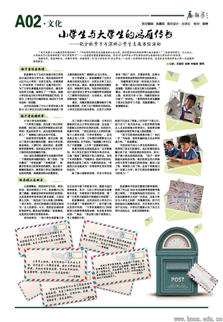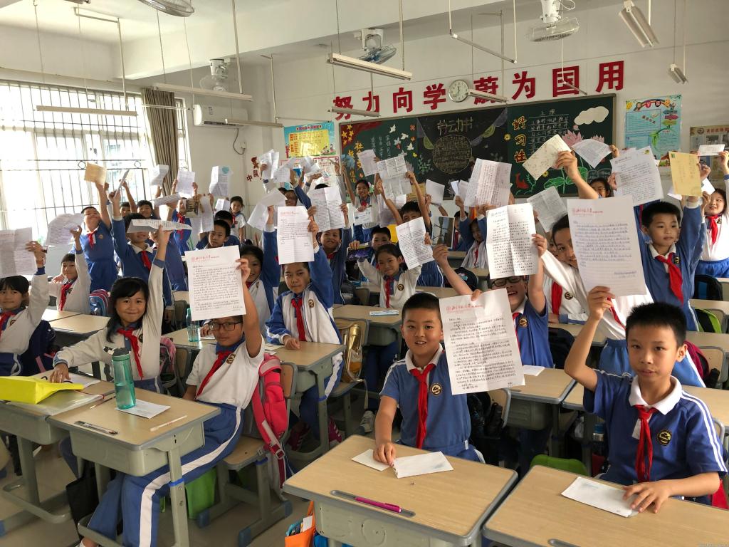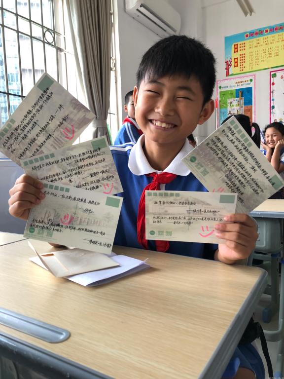 在小学课堂上,彭波娜播放了北师大珠海分校招生宣传片,向学生分享了自己的大学生活。课后,她联系母校的刘慧珍老师,请她帮忙宣传。刘老师欣然答应。2017级汉语言文学专业刘越同学在课程班上了解到书信活动后,主动报名,成为组织联络的“邮递员”。