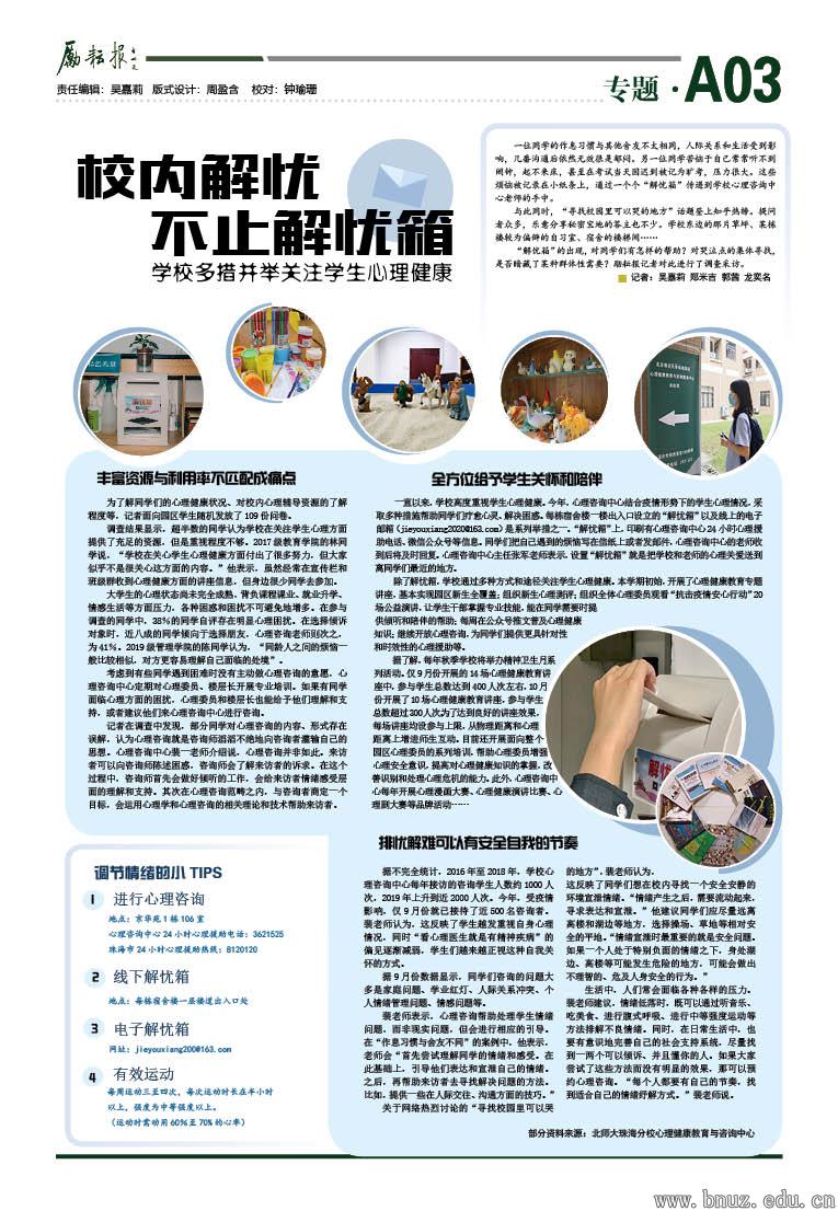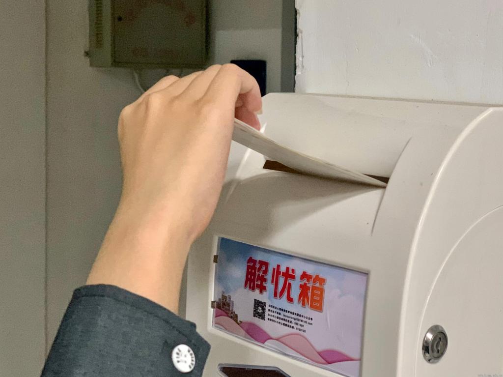 一直以来,学校高度重视学生心理健康。今年,心理咨询中心结合疫情形势下的学生心理情况,采取多种措施帮助同学们疗愈心灵、解决困惑。每栋宿舍楼一楼出入口设立的“解忧箱”以及线上的电子邮箱(jieyouxiang2020@163.com)是系列举措之一。“解忧箱”上,印刷有心理咨询中心24小时心理援助电话、微信公众号等信息。同学们把自己遇到的烦恼写在信纸上或者发邮件,心理咨询中心的老师收到后将及时回复。心理咨询中心主任张军老师表示,设置“解忧箱”就是把学校和老师的心理关爱送到离同学们最近的地方。