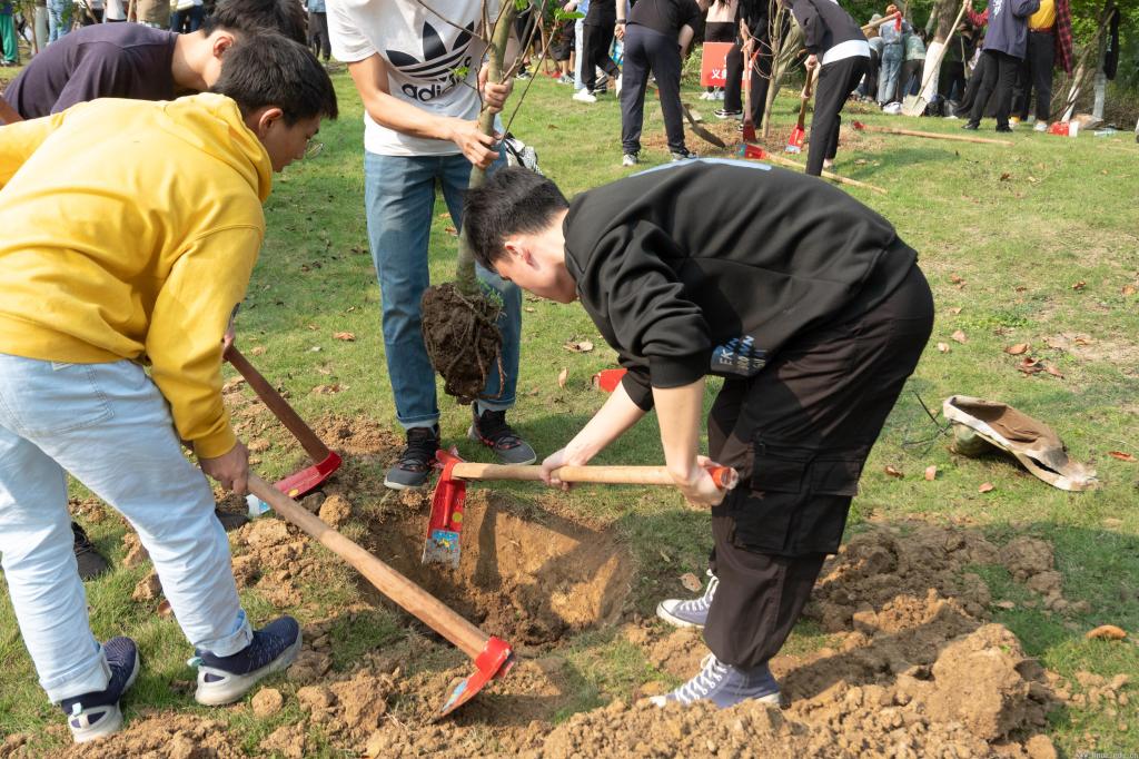 植树现场,同学们分工协作、挥洒汗水、干劲十足,挖坑、放苗、培土、浇水……新栽的树苗整齐林立、展露新颜,大家纷纷与苗木合影留念,脸上满是收获的喜悦。