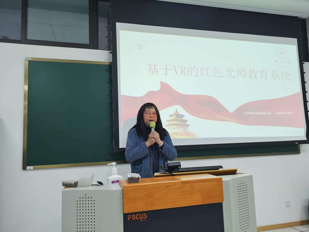 随后,黄静围绕学院课程思政建设,结合学习党的二十大精神的心得和体会,给全体教工讲专题党课。她指出,学院成立课程思政建设工作小组并制定了学院课程思政建设实施方案,院长书记带头落实,各个专业同步开展,通过思政第一课、课程教学改革设计、参加培训、观摩学习、交叉听课、研讨交流等方式促进课程思政建设。截至目前,所有任课教师均已将党的二十大精神融入了课程思政中,其中赵志文院长的《Python程序设计》申报广东省教育厅推荐课程思政示范课堂,贺辉老师的《操作系统》入选校区思政课程示范课程立项,杨戈老师的《计算机视觉与模式识别》入选校区课程思政示范课堂立项。专题党课以《Python程序设计》爬虫技术章节和《基于VR的红色北师教育系统》为例,进行了思政课程案例交流。