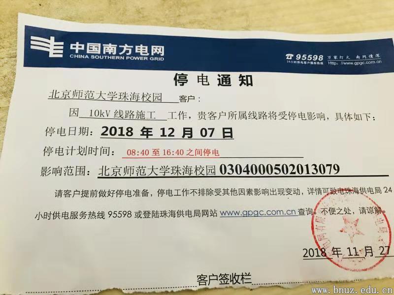 受上述施工影响,我校京师家园将会停电,计划停电时间为2018年12月7日(周五)08:40-16:40。请校内各相关单位提前做好停电准备工作,期间所产生的不便,敬请谅解。