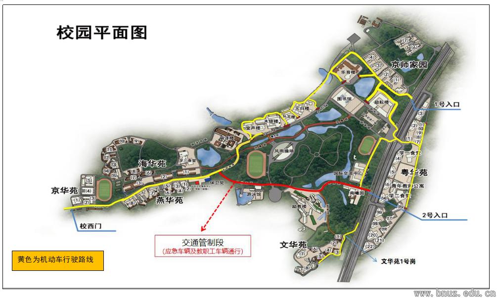机动车校内通行道路为:京师路-丽泽东路-会同南路,上述路段均属双向通行道路,严禁靠边停车。会同北路禁止机动车通行。(详见示意图)