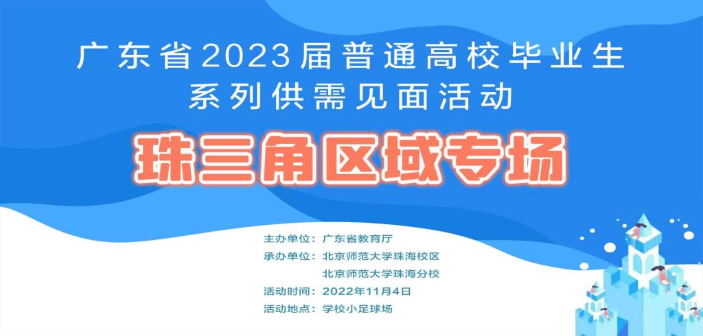 您好!为贯彻落实党中央、国务院和省委、省政府关于做好高校毕业生就业工作的决策部署,进一步加大本省高校毕业生就业服务工作力度,拓宽高校毕业生就业渠道,根据广东省教育厅统一部署,定于2022年11月4日(星期五)在北京师范大学珠海校区举办广东省2023届普通高校毕业生系列供需见面活动-珠三角区域专场。